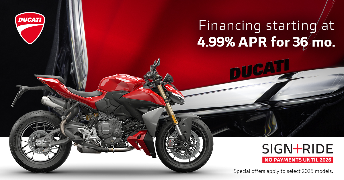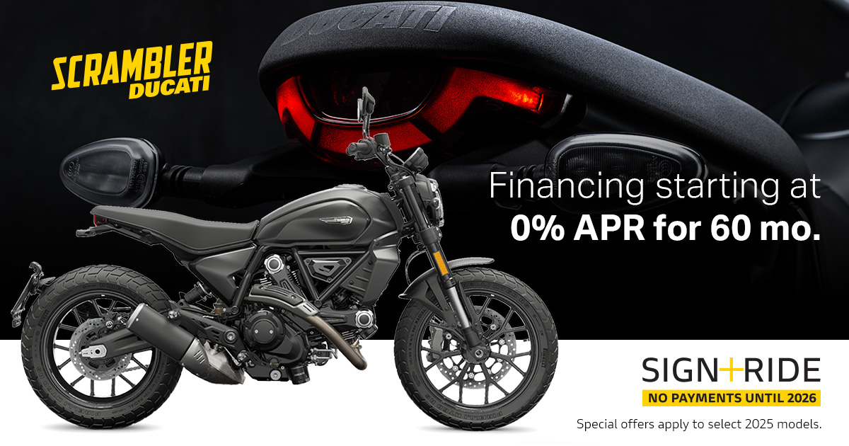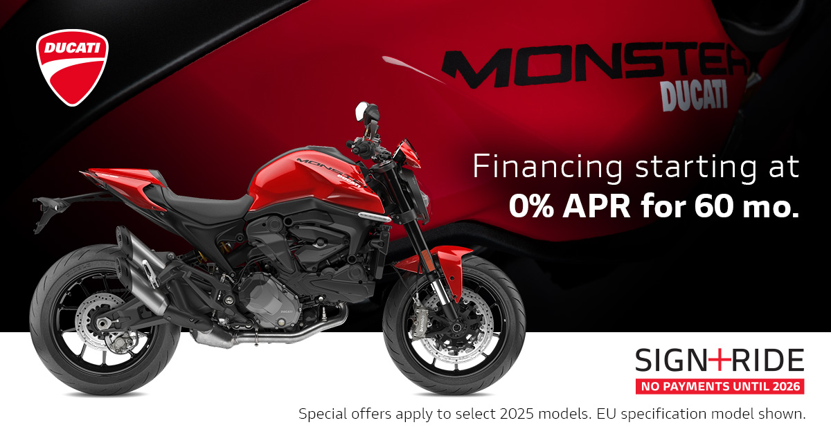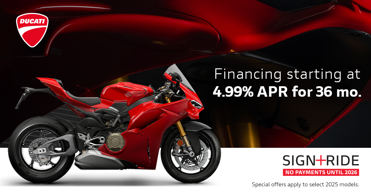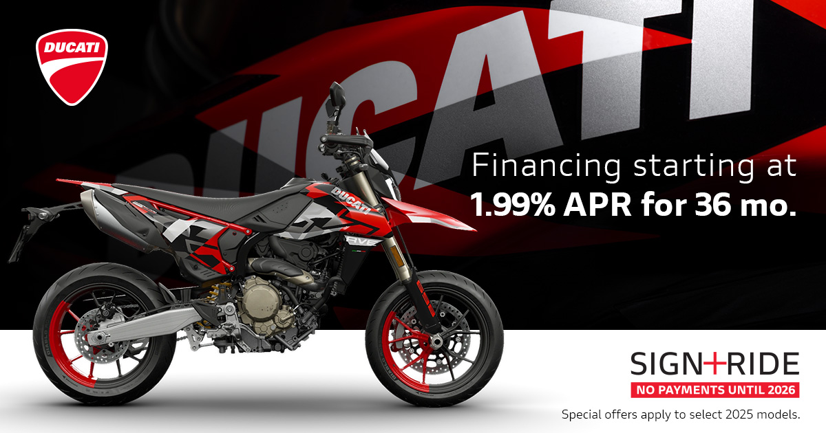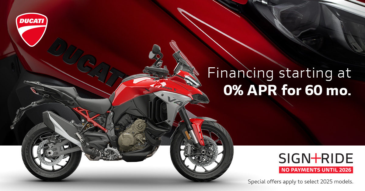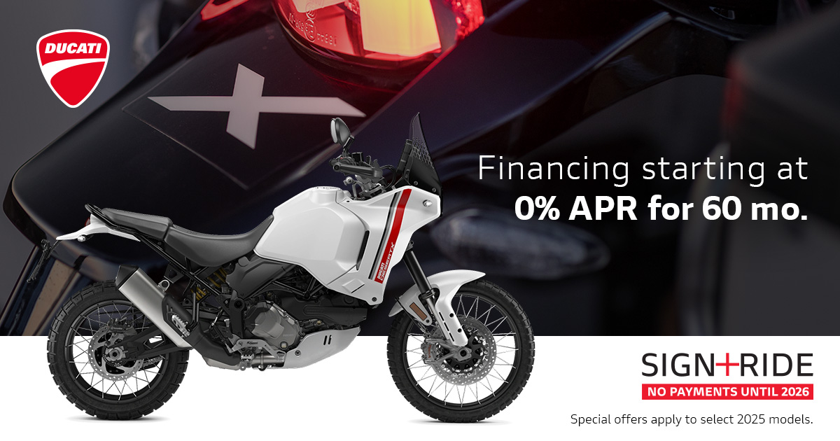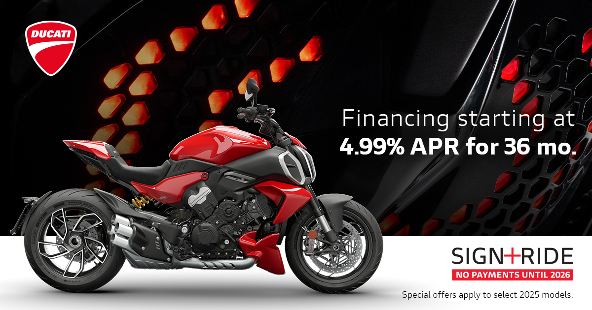 Make the most of the riding season with Ducati's current offers. Highly qualified customers can take advantage of 150 days payment-free and competitive financing.